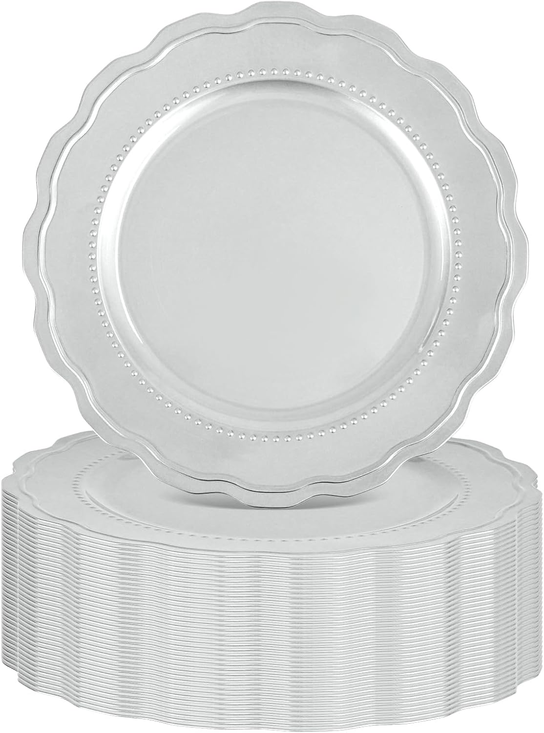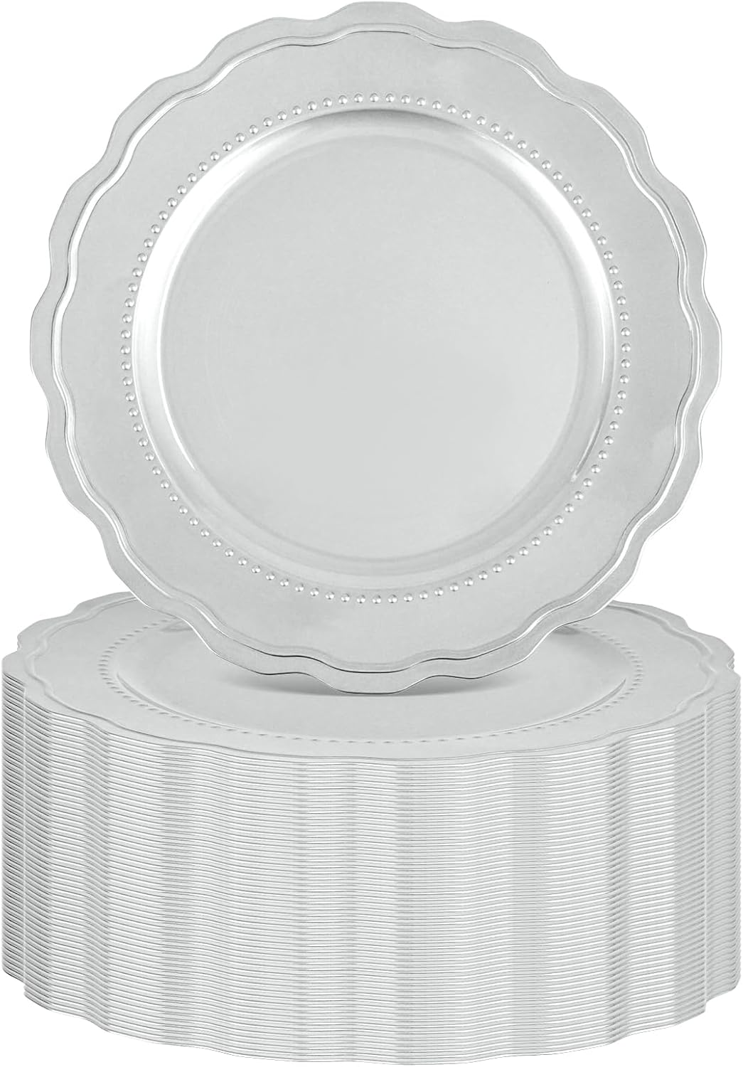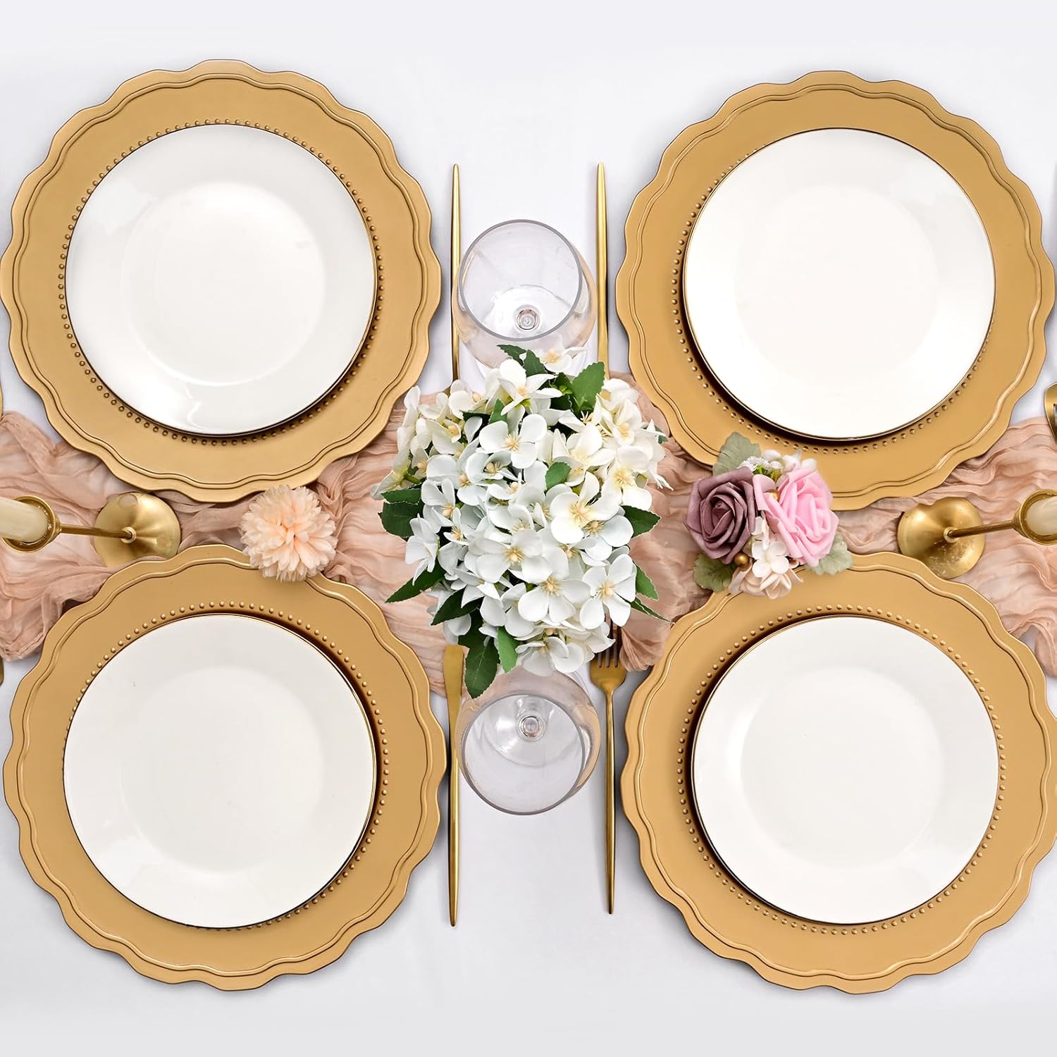 Features:The classic circular shape and unique wavy shaped edge design make it the perfect match for modern and traditional dining table settings.Simple and classy, Easy to matchWavy-like chargers are made of premium plastic material, thick and sturdy, plastic charger plates are textured and reusableUnlike fragile materials such as glass or ceramics, these plastic chargers are not easily broken and are sturdy and durableThese plate chargers fit under salad plates, soup bowls, and dinner plates to prevent spills and messes ,This can make your dining table cleaner and more elegantThese wavy plates cannot come into direct contact with food, please use them together with the plates.This Charger platesr suitable for weddings, receptions, proposals, carnivals, celebrations, or as a gift for family and friends.Specifications:Color: GoldMaterial: Premium eco-friendly plasticDimensions: 13 inch diameter/ 33 cmUses: Wedding, Party, Event, BanquePackage includes:36 x gold wavy charger platesTips:This is a charger plates that can be cleaned repeatedly. Ensure longevity by hand washing and rinsing under tap water. Avoid dishwasher and microwave use to maintain the integrity of your charger platesWarm Notice:1.Manual measurement, there will be an error of 1-2cm.2.Our products are all real shots.The color of the display screen of mobile phone and computer is different, there will be color difference, please understand.3.If you have any questions about the purchase or use of the product, we will provide you with solutions to solve the problem.