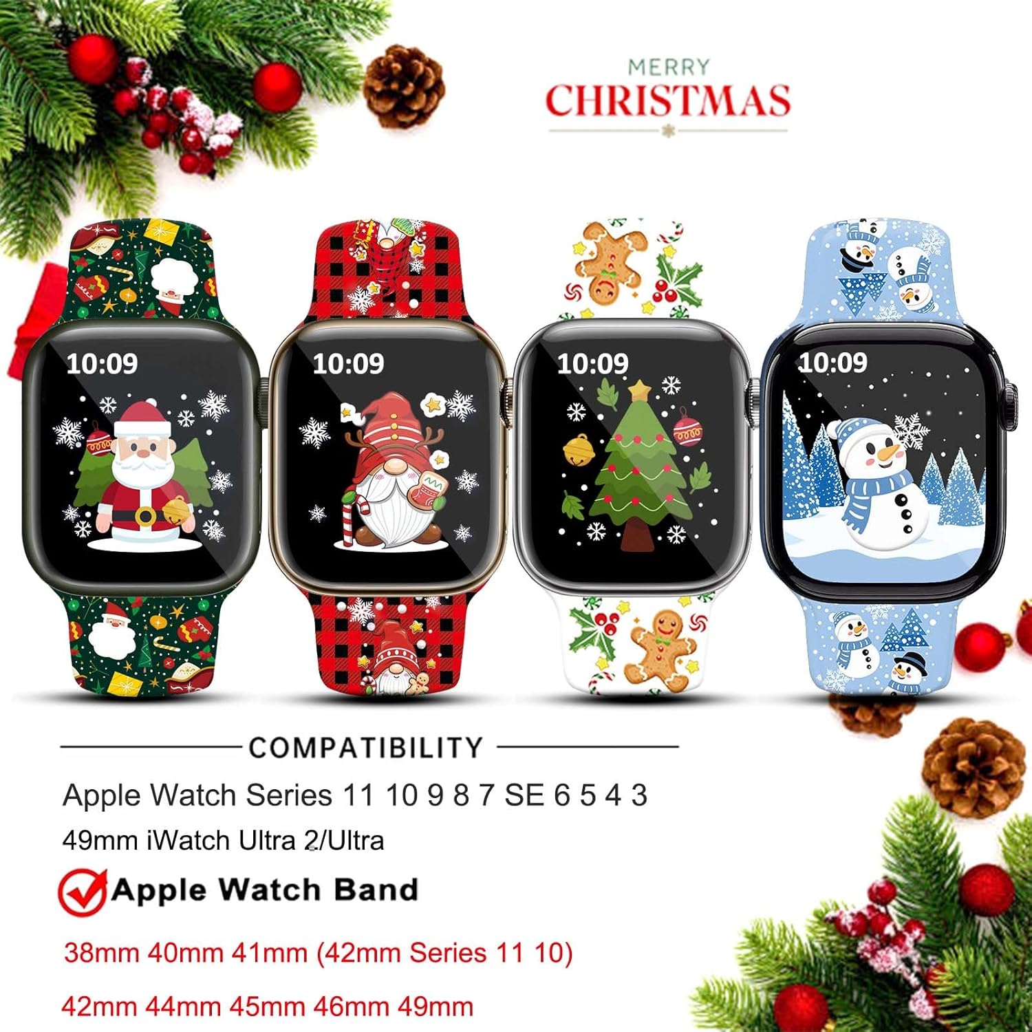 Compatible with Apple Watch Band 38mm 40mm 41mm 42mm 44mm 45mm 46mm 49mm ,Winter Snowman Snowflake Xmas Gift Silicone Sport Replacement iPhone Strap for iWatch Series 10 9 Ultra 8 7 6 5 4 3 2 1 SE Women Men Enjoy the holidays in style with the AYCQ Festive Christmas Apple Watch Band. Whether you wear it on Halloween Christmas, New Years, or anytime in between, this watch band will add a dash of holiday cheer to your life. This product is a pack of 4 silicone watch bands for Apple Watch. They can be used to replace the bands of your Apple Watch and they are soft and comfortable to wear. Unique Design- Simple and elegant shape, fresh pattern band color brighten up your apple watch more stylish, unique and eyes-catching. All kids, boys, girls, man and women who love beauty worth having it Easy and Convenient-The band is processed through special craft, easy to install or remove the extra links to fit your wrist perfectly.