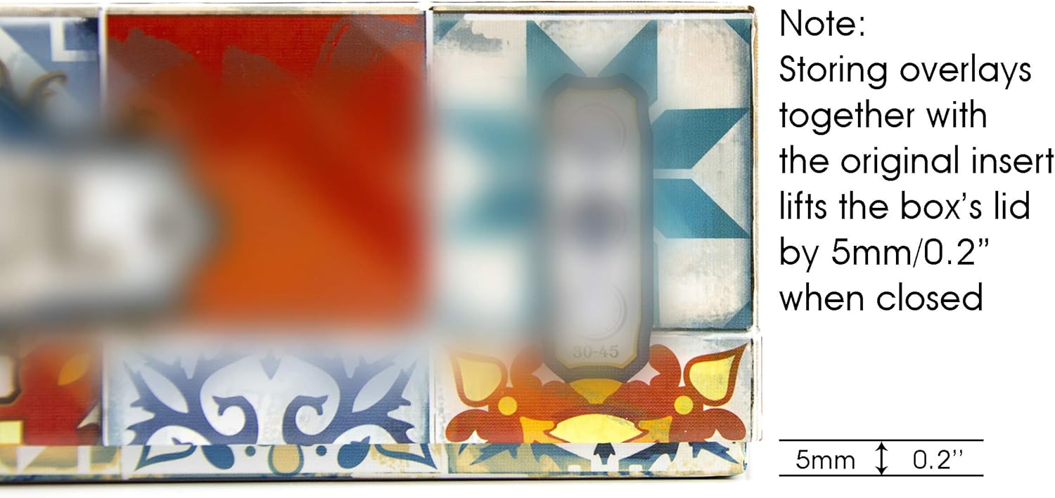 November 2024 update: no more annoying blue film, only easy to remove frosty film on the overlays. The overlay thickness incresed to 2mm for better sturdiness. A set of four acrylic overlays for the Azul player boards. The overlay is made of clear acrylic with 2 mm thickness and it is very light. The weight of one overlay is only 60 g (0.12 lb). It is possible to store the overlays together with the original insert but the box lid does not close flush by 7 mm. The overlays do not require assembly and ready to use out of box. Just peel off the protective film and place the overlay over the mat. This overlay has no backboard. The overlay has no adhesive. PLEASE NOTE: The game is not included. This is a third-party accessory designed by Gaming Trunk. All product names are trademarks of their respective owners, which are in no way associated or affiliated with Gaming Trunk.