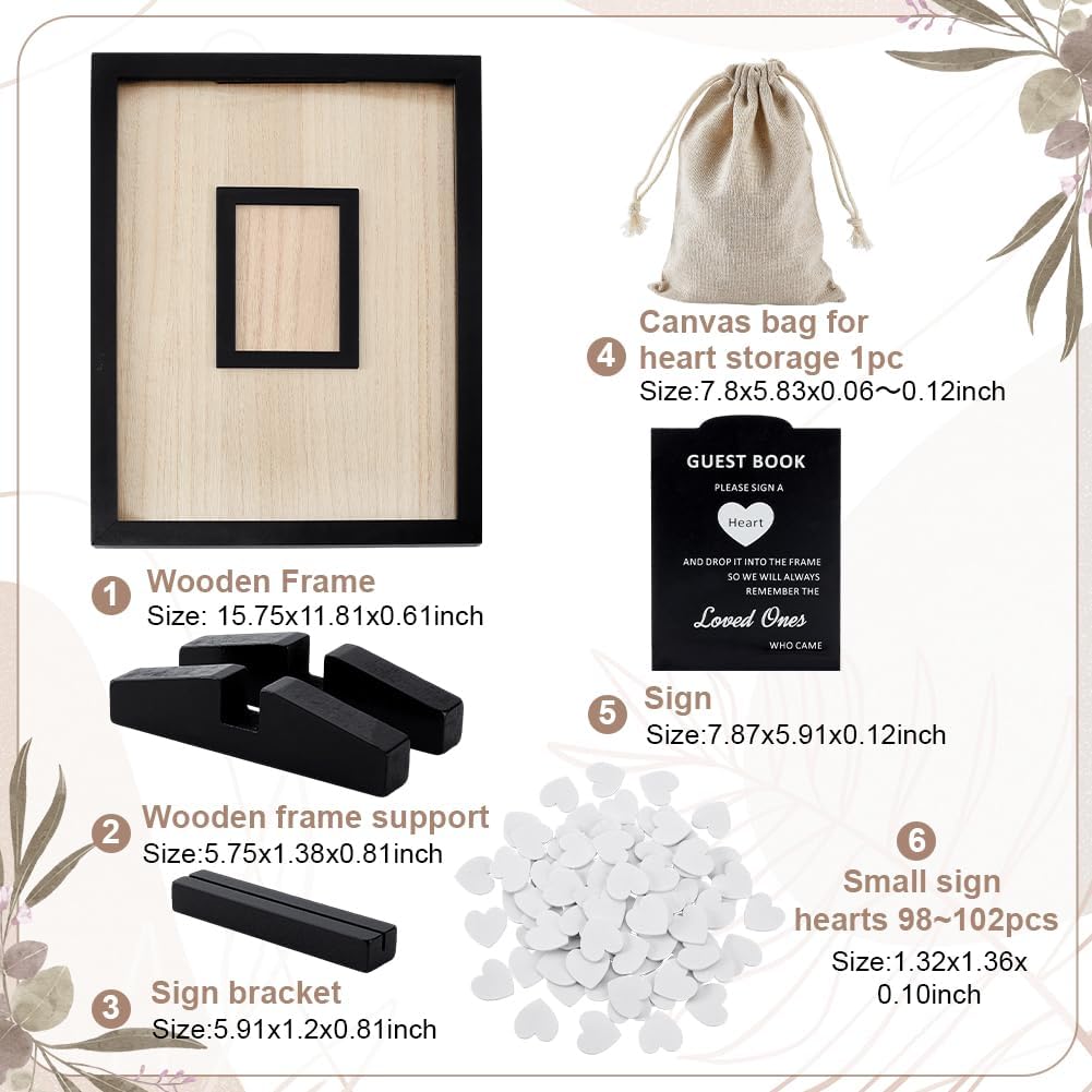 Introduce: Size: finished product: 146x300x400mm and 30.5x150x210mm; wood: 400x300x15.5mm, inner diameter: 365x261mm, 1pc; board: 200x150x3mm, 1pc base: 150x30.5x20.5mm, slot: 3mm, 1pc; base: 146x35x20.5mm, slot: 19.5mm, 2pcs; bag: 180x130x1.5~3mm, 1pc; heart: 33.5x34.5x2.5mm, 98~102pcs. Color: Black Material: Wood Shape: Rectangle Our wedding welcome sign for your reception is a simple yet thoughtful way to preserve and cherish the memory of those who came