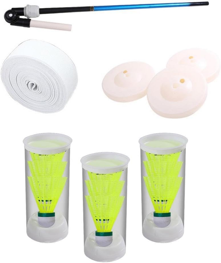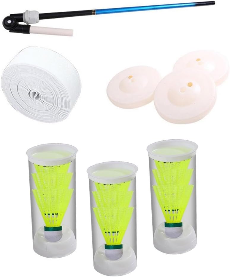 Description: - 【Adjustable Elastic Rod】The retractable elastic rod allows for height adjustment, extending up to 330cm/129.92inch at its maximum and to approximately 65cm/25.59inch for easy storage and portability. - 【Triple Layered Water Filled Base】: The base features a three layer water filled design with size 21cmx3cm/8.27inchx1.18inch per each When filled with water, it weighs around 2.8kg, and when empty, it weighs approximately 0.3kg, making it very convenient to carry. - 【High Stretch and Durability】: 260cm/102.36inch highly elastic and rope weighs around 0.3kg which can be used for about 20 days. And It can be cut and adjusted to control height of the shuttlecock. - 【Quality Material】: Portable Self Practice is made of premium PVC material, , lightweight and long using time, great for outdoor playing, training, exercising, etc. - 【Great Gift Choice】: Single Badminton Training Device Adjustable Equipment Tool Set is also a wonderful gift choice for families and friends on birthdays, holidays, festivals, etc.Specification: - Material: PVCSize Chart:Elastic Rod Length: Contracted 65cm/25.59inch, Expanded Length 330cm/129.92inchBase: Diameter 21cm/8.27inch, Height 3cm/1.18inch (9cm/3.54inch After Stacking 3 Pieces)Badminton: Diameter 6cm/2.36inch, Height: 7cm/2.76inchPackage Includes:As You Choose:3 Water Filled Base1 Elastic Rod(Random Color)1 Connector40 Elastic RopesOr3 Buckets Of Badminton (Three Badminton In Each Bucket and Badminton is not included.)(Random Color)Note: