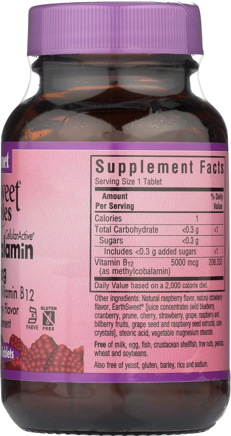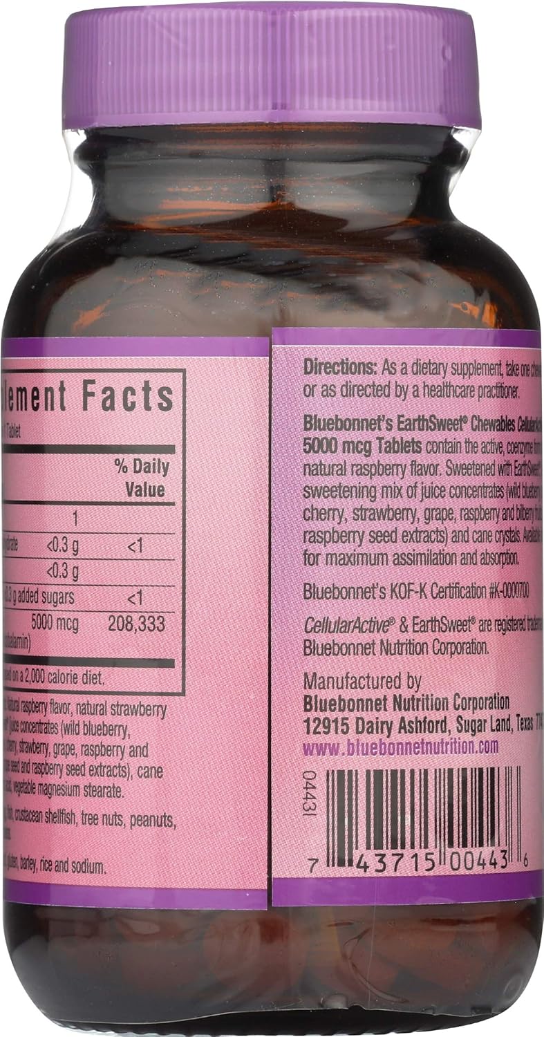 Cellular Energy Production & Nervous System Health Non GMO Vegan Kosher Parve Gluten Free With Other Natural Flavors Dietary Supplement Bluebonnet's EarthSweet Chewables CellularActive Methylcobalamin 5000 mcg Tablets are formulated with the active, coenzyme form of vitamin B12 that supports cellular energy production and nervous system health in a delicious raspberry flavor. Sweetened with EarthSweet, a proprietary sweetening mix of fruit powders and sugar cane crystals.