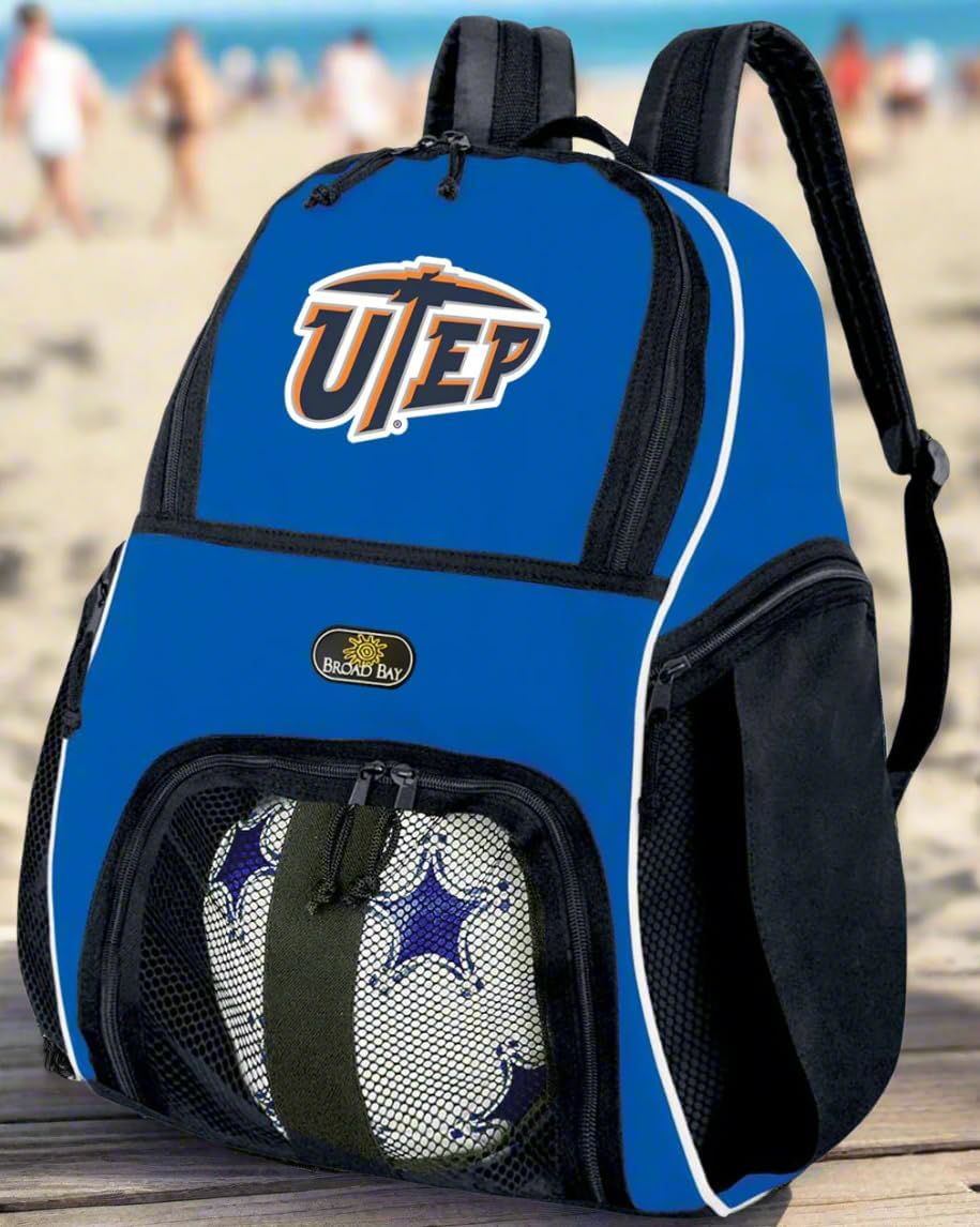 This Official UTEP soccer ball backpack or UTEP volleyball bag is perfect for soccer or volleyball practice. This well-designed UTEP soccer ball bag is made of strong 600 Denier Fabric. The mesh paneled interior ball compartment keeps your soccer ball or volleyball separate from the main gear section. The large main section of this great UTEP soccer backpack or volleyball backpack measures approximately 10in x 13in x 9in after the ball is inside and it still has plenty of room for your shin guards, cleats, and a change of clothes. Two secure zippered side pockets are great for your water bottle, keys. And accessories. This tough UTEP soccer ball backpack or volleyball bag features adjustable padded shoulder straps, a top handle strap and dual zipper pulls on both the main section and the ball compartment. The base is 16in x 8in not including pockets. This unique UTEP Miners soccer ball carry backpack or UTEP Miners volleyball gear bag is 18in high. ** Official UTEP Soccer Ball Backpacks & UTEP Miners Volleyball Bags- Up to 12% Returned To Support UTEP Miners Programs!