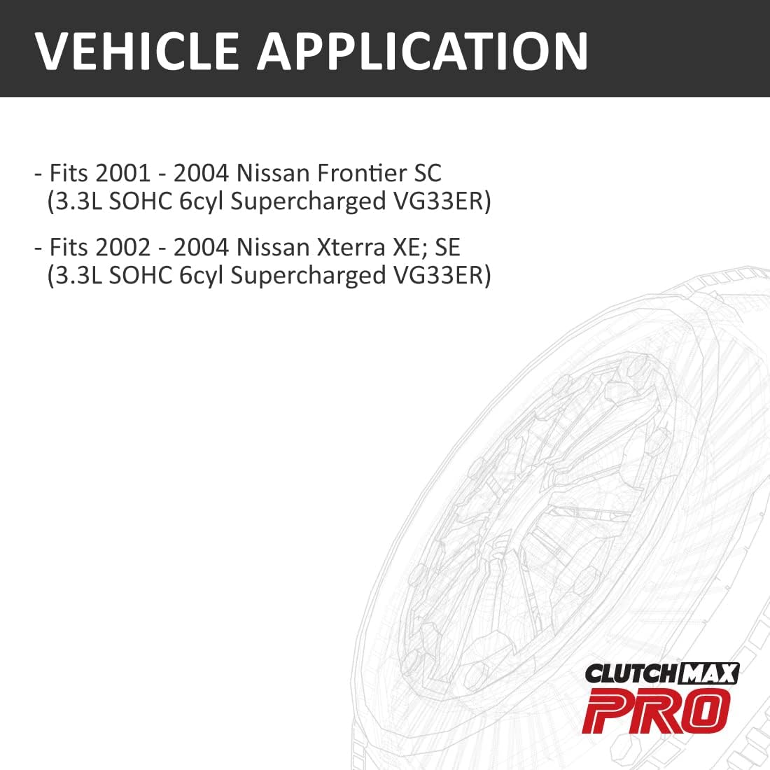 Vehicle Application Fits 2001 - 2004 Nissan Frontier SC (3.3L SOHC 6cyl Supercharged VG33ER)Fits 2002 - 2004 Nissan Xterra XE; SE (3.3L SOHC 6cyl Supercharged VG33ER) About ClutchMax PRO ClutchMax PRO® has 20+ years of history supplying very best clutch products to top tier clutch brands in Japan, UK, Australia and U.S. ClutchMax PRO® has taken this experience and a new approach to re-engineer performance clutch industry and is now one of the fastest growing performance clutch company in the world. Compatible model and year list Please enter your Year, Make and Model above using Amazon’s ‘My Garage’ tool - the tool will specify which clutch kit fits your vehicle Questions or Concerns? If you have any questions/concerns, message us using Amazon’s ‘contact seller’ form. We respond to all messages within 24 hours.