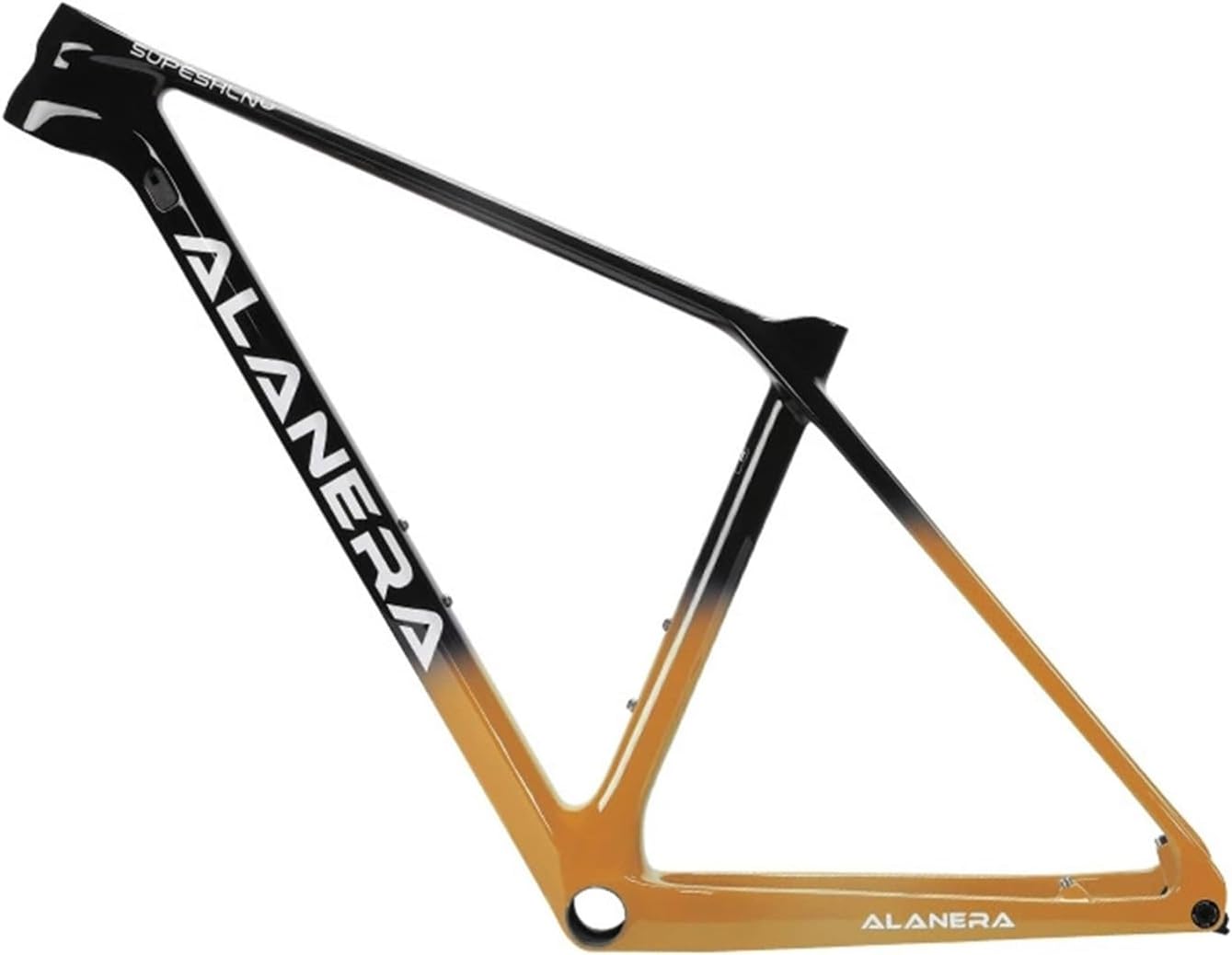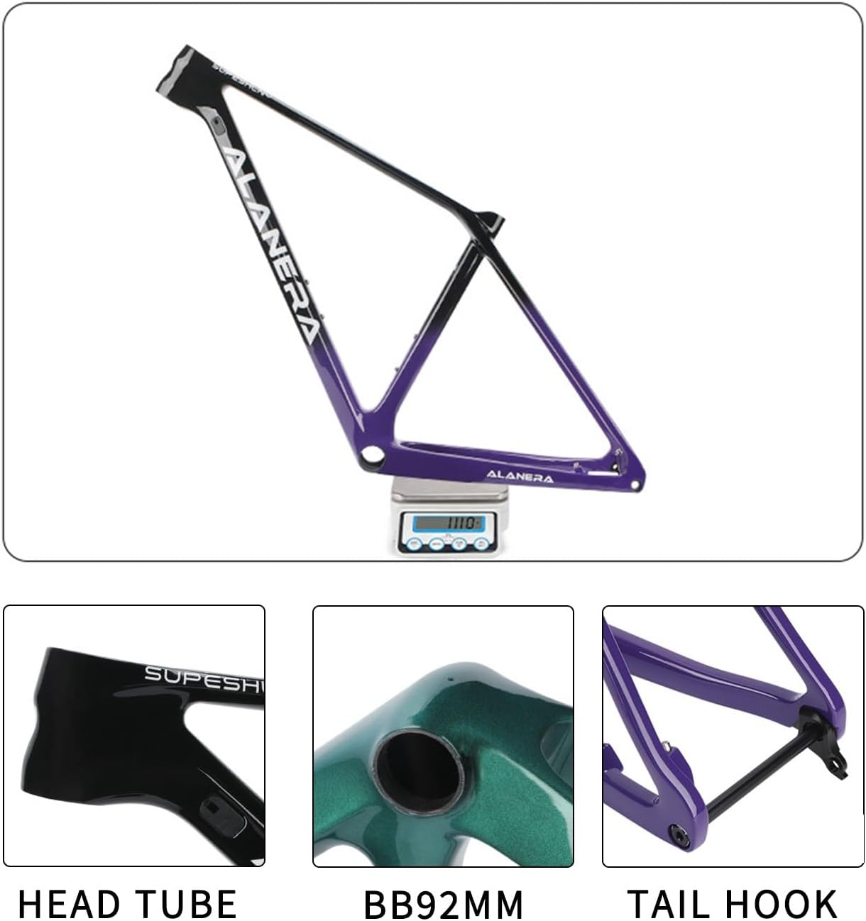 Carbon Mountain Bike Boost FrameName : Mountain Bike FramesMaterial:T800 Carbon fiberFrame Size:XS 15"/S 16"/M 17"/L 19"For wheel:29'' wheelsCable : Internal Routing/external routingColor:Blue , Gray , Green , Orange , Pink , Purple , Red , White , Yellow , Desert YellowSeatpost : 31.6mmHeadset:52*52mmBottom Bracket:BB92mm press-in Thru-axle: boost 12*148mm Weight:1110g(M)Sprocket: Single-ring, supports up to 38TSuitable for cycling scenarios:XC/AM/DHNote: Please check if the size of bike frame is correct before purchasing.