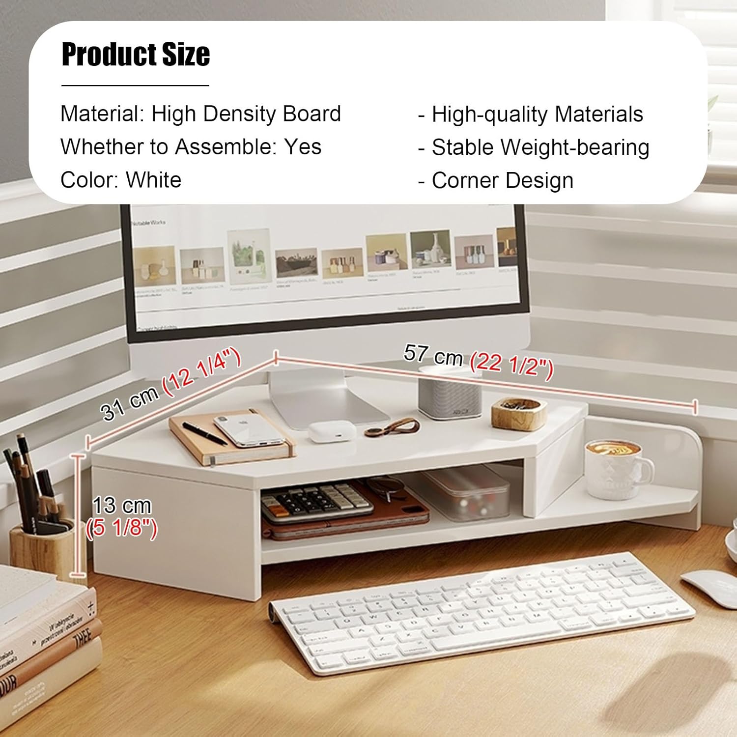 This ergonomic monitor stand is aesthetically pleasing to decorate your desktop in addition to office and storage use.Specification- Material: High Density Board- Heights: 13 cm (5 1/8")- Whether to Assemble: Yes- Color: Black, White, OakFeature- Sturdy construction with modern design.- Arc corner design, prevent injuries.- Easy to assemble, no hassle.- Helps to keep your desk clean and organized.- Waterproof, easy to care for and clean.- A surface large enough to accommodate a monitor or laptop.Package Contents- 1 × Monitor Stand. (Including mounting accessories)Warm Tips- Due to different display and different light, there may be some color difference between the picture and the product.- Due to manual measurement, there is a 1-2 cm error, specific to the actual size shall prevail.After-sales Service- If you have any questions about monitor stand, please do not hesitate to contact us, we provide 24-hour customer service.