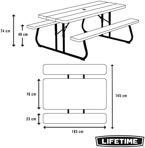The 182.88 x 76.2 cm high-density polyethylene tabletop is stain resistant, easy to clean, and Folds flat for storage. This 60112 comes in Brown with a wood grain texture and a bronze 4.1275cm round folding frame that includes an Umbrella hole and cap. Single box packaging.