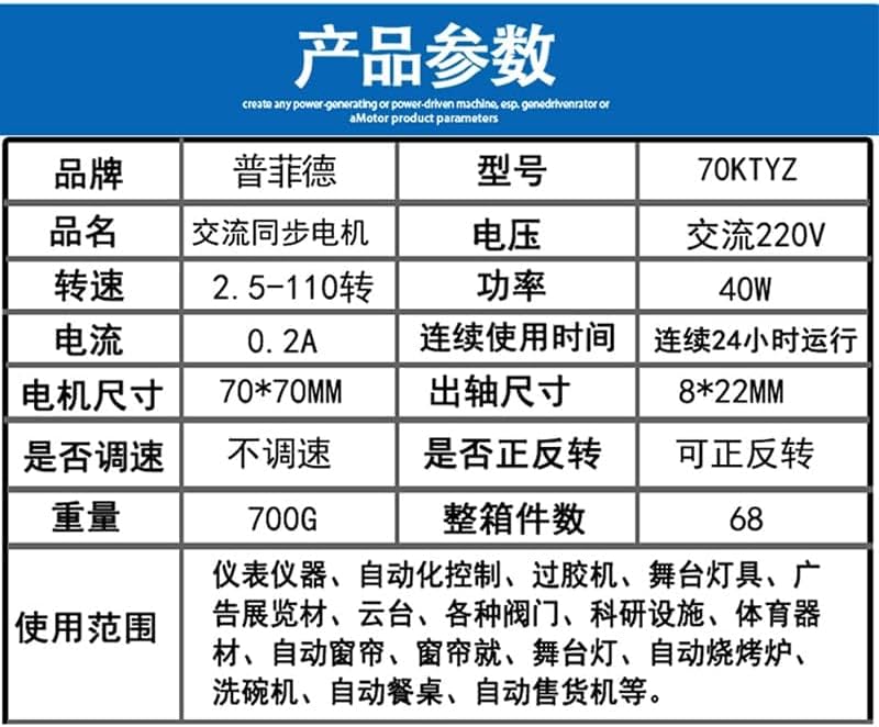 Low Speed Geared Motor 70KTYZ Permanent Magnet Synchronous Motor Adjustable Direction High Torque Low Noise Motor 220V AC 40WSpecifications: 70KTYZ Voltage: AC220V Frenquency: 50Hz~60Hz Power: 40W Motor Dimension: 70mm*70mm Output Shaft Diameter: 8MM Output Shaft Length: 22mm 1) Does not support speed control 2) Can work continuously for 3) Motor shaft rotation support CW/CCW 4) All metal gears Application range Automation control, stage lighting, advertising materials, various valves, scientific research facilities, sports equipment, automatic curtains, barbecue, dishwasher, automatic dining table, vending machine etc. Speed: 2.5rpm 5rpm 10rpm 15rpm 20rpm 25rpm 30rpm 50rpm 80rpm 110rpm