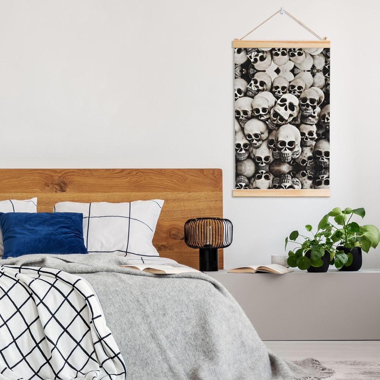 Our Mexican Skull Print Wooden Poster Hanger Is An Excellent Addition To Your Home Decor Or A Perfect Gift For Friends And Family. Made Of Selected Quality Canvas With Brilliant And Enduring Colors, This Wall Art Is Designed To Resist Water, Dust, And Fading, Ensuring The Bright And Vibrant Art Lasts. The Polyester Is Enclosed Between Two Teak Wood Hanger Scrolls With An Attached 35cm Rope For Easy Hanging. Installation Is Made Simple With The Included Two Nails In A Plastic Box. The Modern Minimalist Style Of Our Wall Hanging Complements Any Home Decor, Elevating The Artistic Ambiance And Brightening Up The Room. Experience The Elegant Transformation This Wall Hanging Scroll Painting Brings To Your Spaces Today.