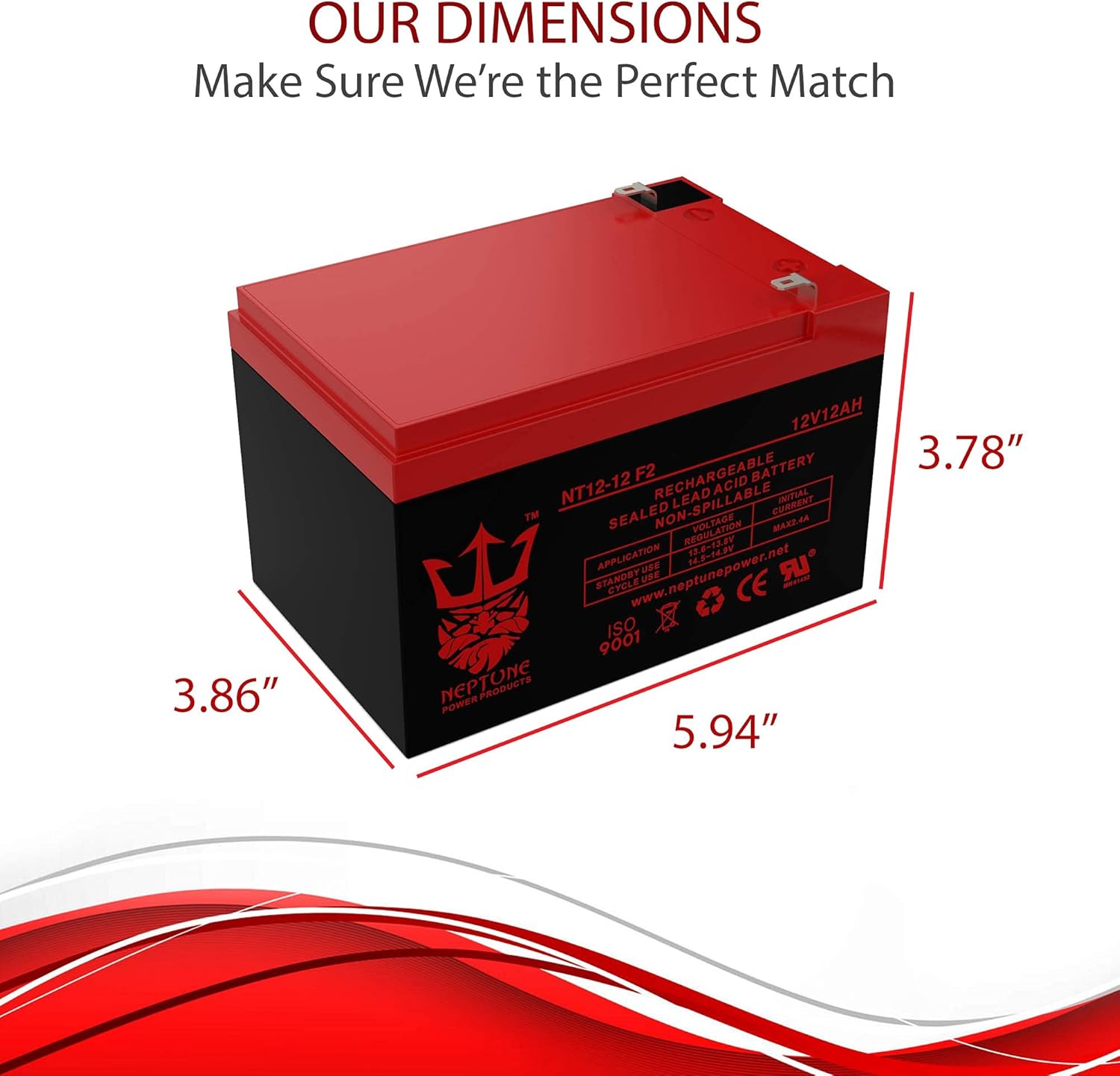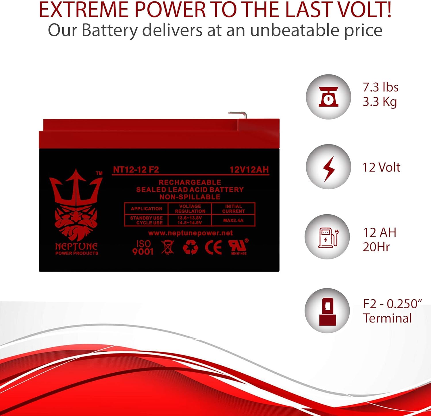 12 Volt 12 Amp-Hour Sealed Lead Acid (SLA) batteries with F2 Terminals by Neptune Power Products are constructed with lead calcium alloy and absorbed glass mat AGM technology which allows a completely maintenance-free and high-performance operation. Fiberglass mat separators and high cell compression extend battery life by delivering superior vibration resistance from the most extreme conditions. All 12V 12Ah Neptune brand AGM batteries are manufactured with the highest quality materials and rigorously tested to ensure safety, OEM compatibility, effectiveness and optimal performance.NT12120 12V 12Ah Battery Features:Patented sealed post prevents corrosion which gives extended battery lifeNo spills, no leaks, and no water to checkExtreme vibration resistance to ensure maximum conductivityHigh Cranking Amps & Low Self-Discharge RateReady for Immediate UseNT12120 12V 12Ah Battery Specifications:Model: 12V12AHSLADimensions : (H) 3.74" x (L) 5.94" (W) 3.86"Weight: 7.3 lbs.Volts: 12VPolarity: [+ -]Terminal Type: F2Condition: NewAlso Replaces: RBC4 equivalent replaces 00801-1460, 12CE12, BP12-12, CB 12-12, CB12-12, CFM12V10, DG12-12, ES12-12, FP12120, GP12110F2, GP12120, HE12V12.7, HR15-12, LCR-12V12P, LCR12V12PF, LC-R1212P, LC-RA1212P, NP12-12, PE12V12F2, Deltec PRM700, PS12100, PS12100F2, PS-12120, PX12120, TR12-12, UB12120, WP10-12, WP12-12 Compatible Replacement For: 6-dzf-12 12v 12ah battery, 6-dzm-12 12v 12ah, djw12-12 12v 12ah, nt12-12 12v 12ah, 12v 12ah plumbic acid battery 0817, 12v toy car battery 12ah, 6-dw-12 battery 12v-12ah 20hr, np12-12 battery 12v 12ah, sla1104 battery 12v 12ah, mobility scooter battery 12v 12ah, RBC4 12v 12ah