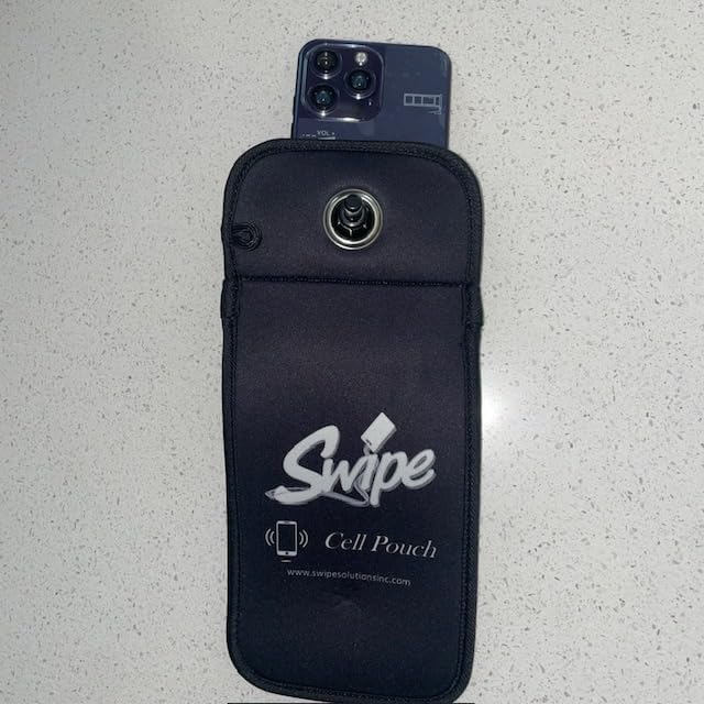 PARENT BUNDLE INCLUDES DETACHER Protect student focus and minimize distractions with this innovative locking cell phone pouch designed specifically for educational environments. Made from durable neoprene material, this sleek black pouch features a secure locking mechanism with a hidden pin system that can only be opened with a magnetic detacher (sold separately). The professional-grade construction includes reinforced edges and a specialized safety enclosure that keeps the locking component concealed when the pouch is opened. Perfect for schools implementing phone-free policies, this pouch offers a practical solution for storing devices during class time. The slim profile allows for easy storage while keeping phones safely secured and out of reach. The pouch displays the Swipe branding and includes a convenient cell phone icon indicator. This security pouch represents an effective tool for maintaining an engaged learning environment while providing secure storage for valuable devices.