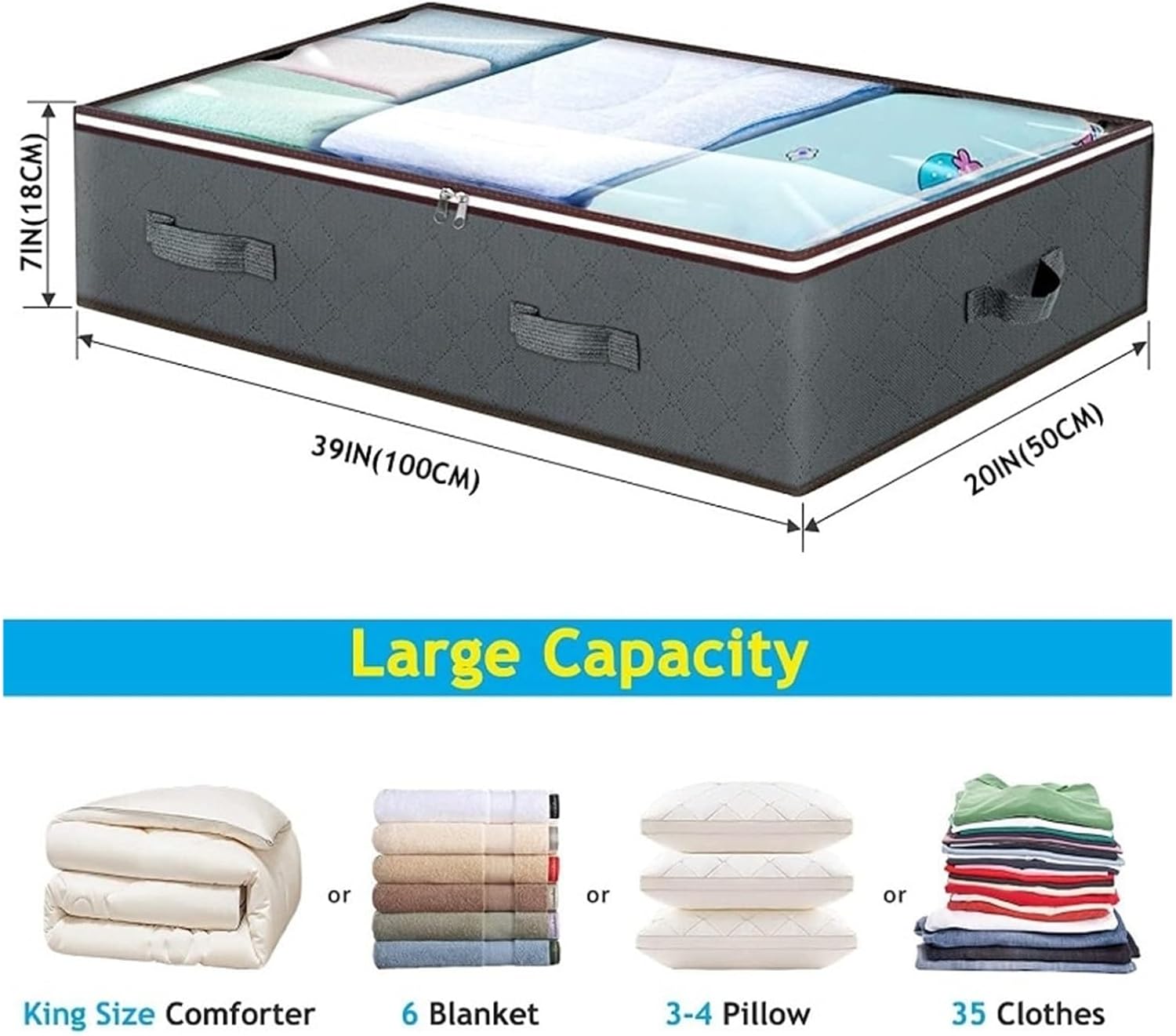 Color Grey Material Nylon Special Feature Lightweight,Foldable,Moisturepof,Breathable Minimalist About this itemnon-woven fabric + pvcPremium Material : The underbed storage containers are made from , odorless, three-ply composite non-woven thick fabric, foldable and breathable, keep clothing fresh from long-term storage. NO cardboard NOR metal supports insert, arrive to you collapsed and packaged in a clear storage bag.90L Large Capacity : Each Underbed Storage Bags has 90 Liter / 24 Gallon load capacity, dimensions: 39 L x 20 W x 7 H inch, 7 inch height designed most underbed space, the 6 Long Fit For Smart Cube bags works well storing items like gift wrap, blankets, linens, pillows, plush toys, comforts, bedding, seasonal clothes, clothing, shoes, holiday decorations, Christmas wrapping papers and etc.Clear Window : The storage bins has large transparent see-through PVC window, which helps you to locate your items at a glance, easily access to what you need. The under-bed organizer under beds, in closets, on shelves or under sofa. A good choice room organization and storage.Reinforced Handles : The wide handles of the clothes storage bags are double-stitched with thick fabric, sturdy enough to pulling out from underbed and moving in your house, reliable long time use.==========Hign-concerned : NoneMaterial : other