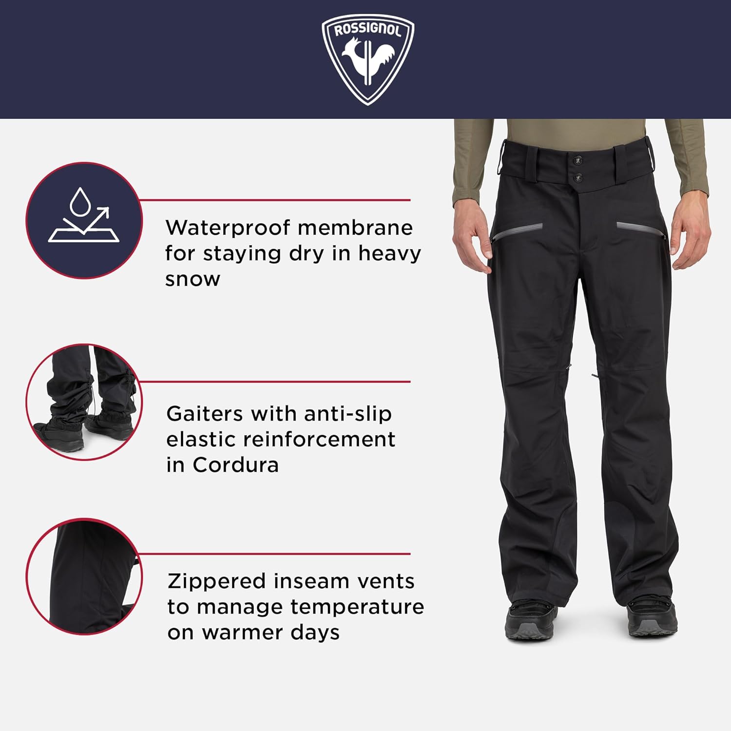 ROSSIGNOL MEN'S WATERPROOF BREATHABLE PACKABLE SKI EVADER PANTS Dedicated skiers require dedicated gear. Our men's Rossignol Evader Pants are the ticket to layering for any weather. The men's Rossignol Evader Ski Pants feature a waterproof, breathable build that sheds stormy weather. Built-in gaiters help seal out snow, and waterproof zippers ensure that your small essentials remain dry and secure. FEATURES: - Fabric weave: Oxford 3L; - Fabric content: 100% Polyester; - Fabric finish: Lamination 3L - Durable Water Repellent (DWR) treatment PFC Free; - Other key features: Packable; - Pocket: 2 Cargo pockets; - Waist: Belt loops and high back; - Gaiters: Coated nylon with anti-slip elastic - Bottom reinforcement in Cordura; - Zip: Vent zip on inseam - Waterproof zippers; - Adjustments: Bottom leg adjustment; - Accessories: Reinforcement in Cordura on inside bottom leg; - Artwork: Slightly contrasting 3D transfer logo on back left leg and colorblock version contrasted knees.