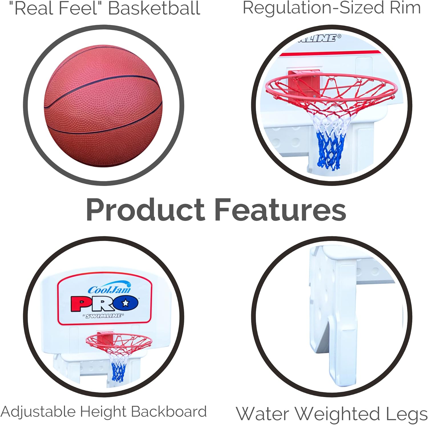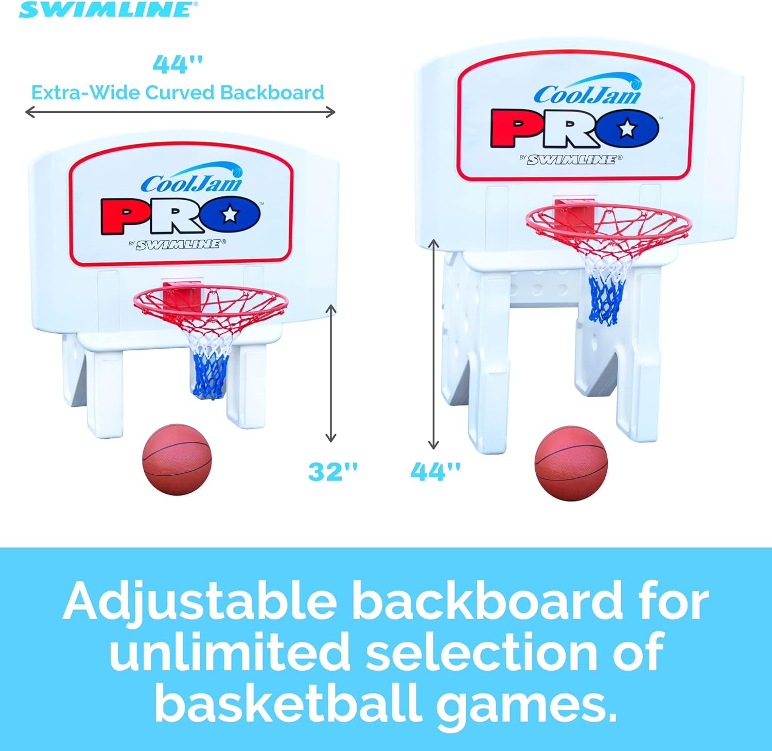 Product Description The Swimline Original Cool Jam Poolside Basketball Game is the ultimate addition to any pool, setting the standard for pool basketball for decades and instantly becoming a classic to any backyard oasis. The game is designed to provide a reliable and realistic basketball experience that is super easy to set up and provides hours of fun for all ages.This premium option features incredibly heavy-duty molded components that are built to last many pool seasons. The metal rim is a real feel regulation rim, providing an authentic basketball experience for players of all levels. You'll feel like you're shooting on a regulation court, all while enjoying the refreshing waters of your pool.Perfect for H.O.R.S.E, slam dunk contests, and competitive basketball games, install one on either end of the pool for full court matches! The innovative molded design features legs that come with fillable compartments to add water or sand for weight and stability, providing the best swimming hoops experience.The game features blow-molded side post stands to make the game feel like a regulation basketball hoop, and comes with various slats so you can modify the height of the rim to your liking. The complete set includes a regulation size game ball, metal hoop, and heavy-duty net to bring the entire basketball court to your pool.Customers love The Swimline Original Cool Jam Poolside Basketball Game because of its oversized 44-inch backboard, leading to fewer basketballs to chase after in the backyard. This game is easy to assemble and incredibly durable, constructed to take season after season of slam dunks and intense basketball action. It's a sturdy basketball game, comparable to units that cost two to three times as much. Plus, it includes a water-fill base and ball.So, bring your A-game and get ready for some water basketball fun that you and your friends and family will remember for years to come! From the Manufacturer Swimline Super-Wide 44" Cool Jam Pro Poolside Basketball