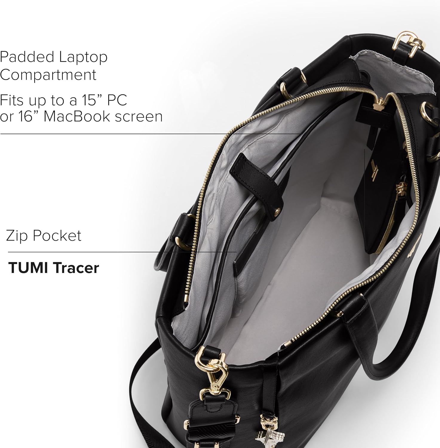 Travel comfortably and in style with the women's Voyageur Vail Leather Tote. Designed as the perfect tote bag for women, this elegant leather bag seamlessly blends sophistication with practicality. Whether heading to the office or exploring the city, the black tote offers ample space to carry all your essentials. The zip entry ensures easy access to the main compartment, while multiple zip pockets keep your belongings organized and secure. A dedicated phone pocket provides quick access to your device, making it perfect for the modern commuter. The padded laptop compartment with leather snap tab (fits up to a 15” PC or 16” MacBook screen) transforms this tote into a reliable laptop bag for your daily needs. Additionally, the water bottle pocket ensures you stay hydrated on the go. The back open pocket converts into an Add-a-Bag sleeve, so you can attach it to your luggage. Durable metal feet protect the bottom of the tote, while the microfiber-lined interior and pen pocket offer additional organization. Elevate your daily commute and travel adventures with this exquisite travel tote, designed to meet all your lifestyle needs. We design for you. Our commitment to exceptional quality and high performing products have made TUMI the leading lifestyle and accessories brand that travelers depend on consistently. This is what we call the TUMI Difference. By putting excellence and quality first, we are committed to creating quality TUMI products that have lifelong purpose, are supported by our rigorous testing standards, use recycled materials and our global repair network.