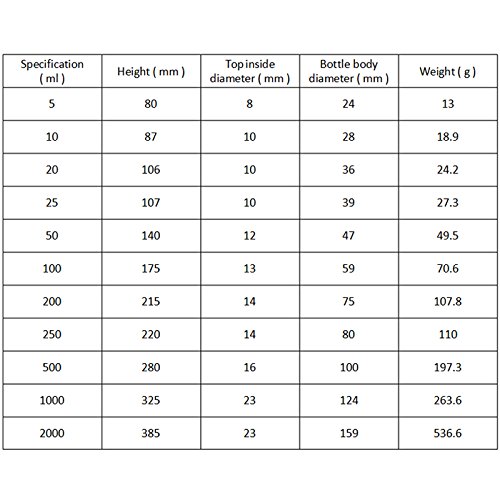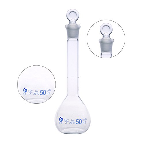 A volumetric flask is an accurate instrument for formulating a precise concentration of a certain substance in a solution. The volume bottle is marked with: temperature, capacity, scale line. There is a scale on the bottleneck of the capacity, which means that when the liquid liquid's concave surface is tangent to the capacity bottleneck's mark at the indicated temperature, the solution volume is exactly equal to the volume marked on the bottle. There are many sizes of flasks, 5ml, 10ml, 20ml, 25ml, 50ml, 100ml, and 200ml, 250ml, 500ml, 1000ml, 2000ml. Material: 3.3 Boro Glass Capacity: 5ml, 10ml, 20ml, 25ml, 50ml, 100ml, and 200ml, 250ml, 500ml, 1000ml, 2000ml Specification parameters: specific parameters as shown in the dimension drawing Number of Items: 1 Features: 1. The total amount of solvent should not exceed the mark of the volumetric flask. Once it exceeds the limit, it must be reconfigured. 2. The volumetric flask can not be heated. If the solute is exothermic during the dissolution process, it must be cooled after the solution is cooled. Because the temperature will increase, the bottle will swell and the volume will be inaccurate. 3. The volumetric flask can only be used to configure the solution, and it cannot be stored for a long time or for a long period of time because the solution may corrode the bottle body and affect the accuracy of the volumetric flask. 4. We very much hope that the product will reach you in a good condition, but this product is a glass product and it is a fragile product. If the product is damaged during transportation, please do not open the return request directly! We can send you a new one! If you have any questions, please contact us in time, we will provide you with the best quality service, your satisfaction is our biggest goal!